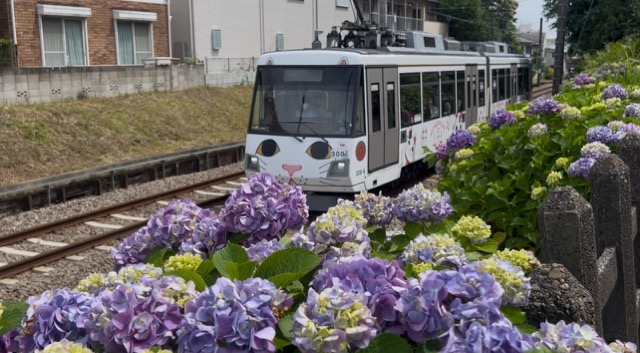 所以先沿著世田谷線散步,事先查好幸福招福貓電車的車次,算好時間順利拍到招福貓電車與繡球花的初夏限定合照。