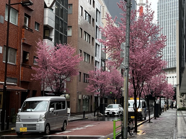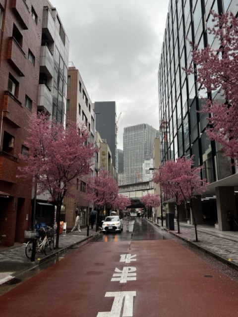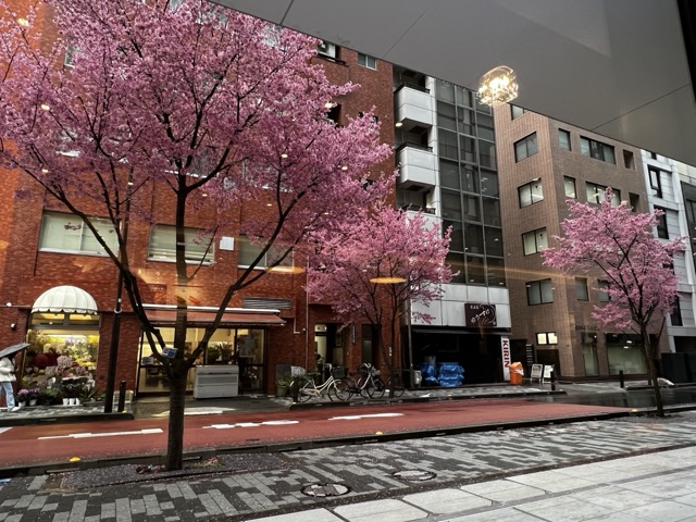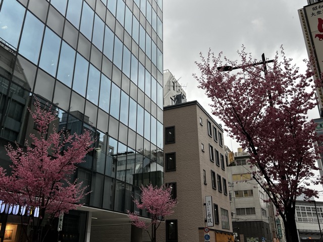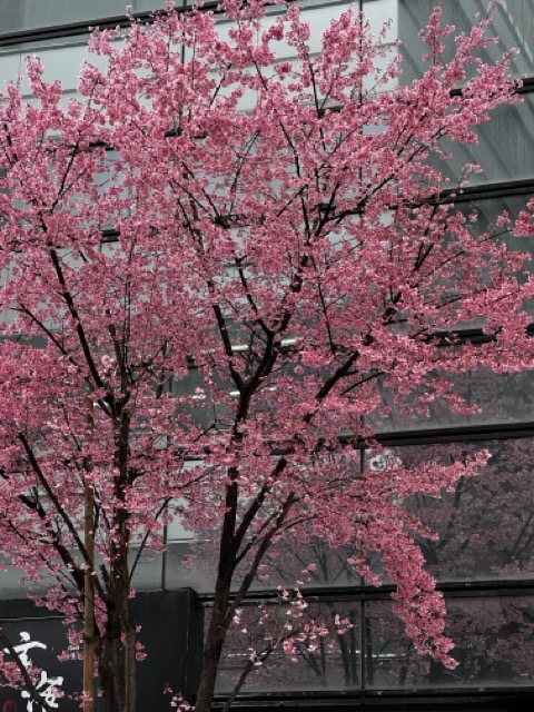 鄰近在商辦建築大樓的粉色櫻花讓冷冽理性的街道,悄悄增添了一絲溫柔與季節感。