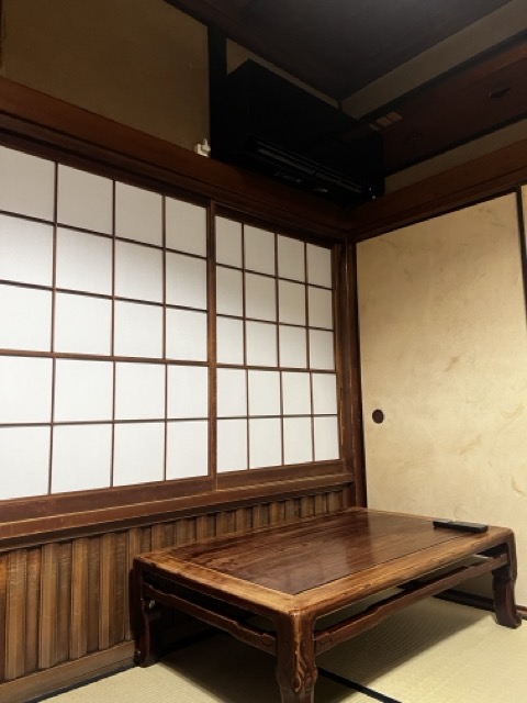 房間的正中央擺著一張用餐的和式木桌和和室椅,桌上排著餐具