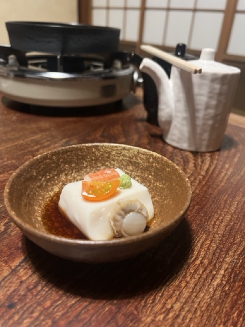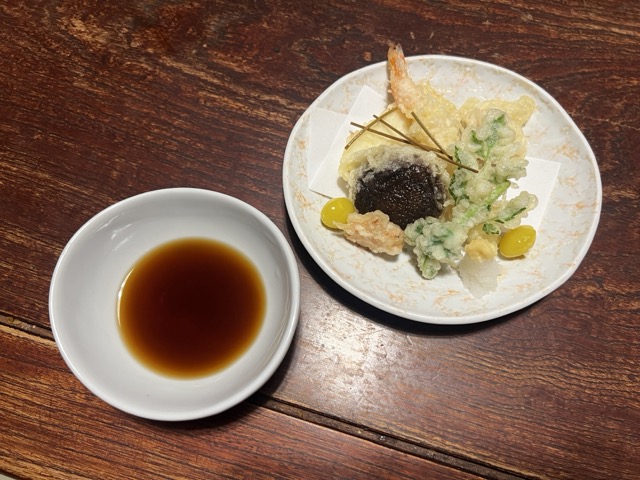 接下來上的是炸天婦羅盤和沾醬,裡面有炸蝦、白身魚、香菇、銀杏、紅蘿蔔和某種葉子