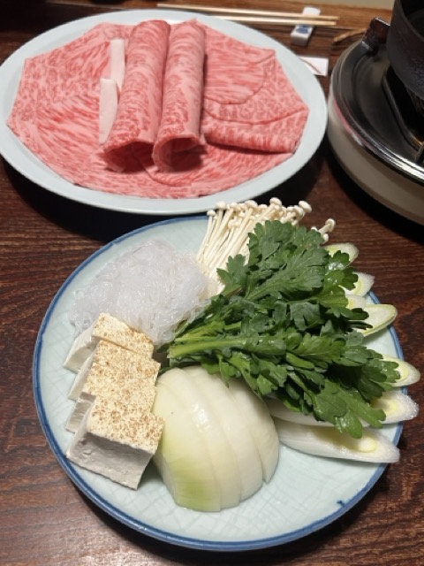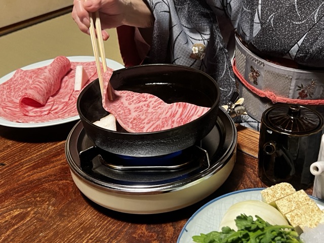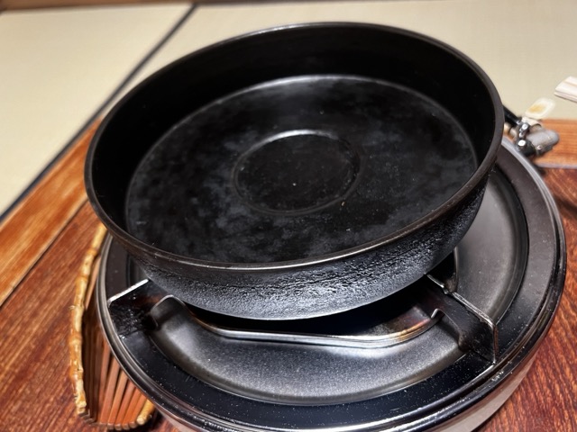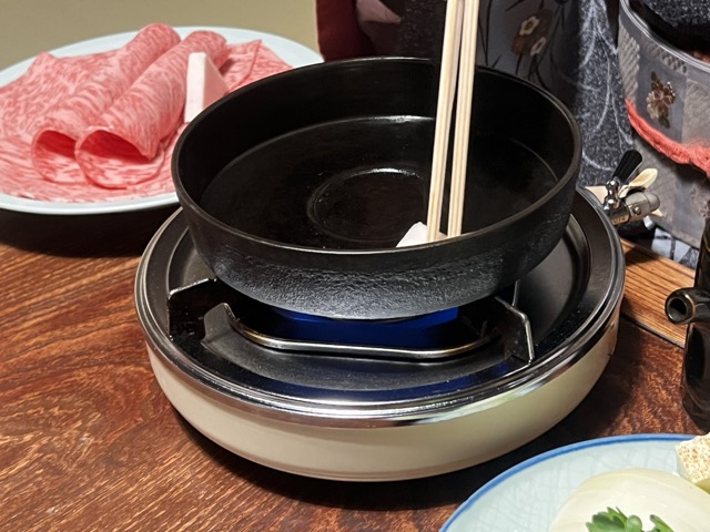 煮壽喜燒的鐵鑄鍋也已經擺放在桌上