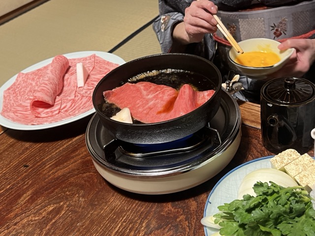 在吃完牛肉盤以及蔬菜盤以後,女將會進來詢問是否需要用壽喜燒的醬汁煮成雑炊,還有飯後水果,