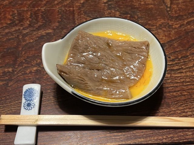 牛肉片一煮好女將就馬上放入蛋液盤裡端到面前,大口吃下剛煮好裹著蛋液的牛肉真的入口即化,十分過癮。