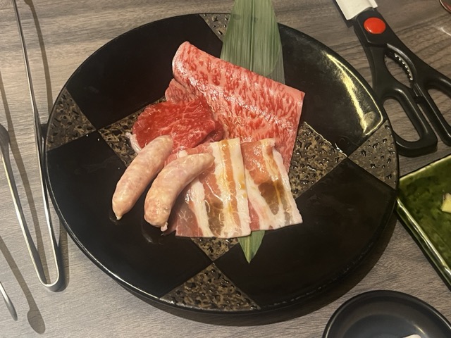 肉盤,裡面有香腸、豬肉片跟牛肉片