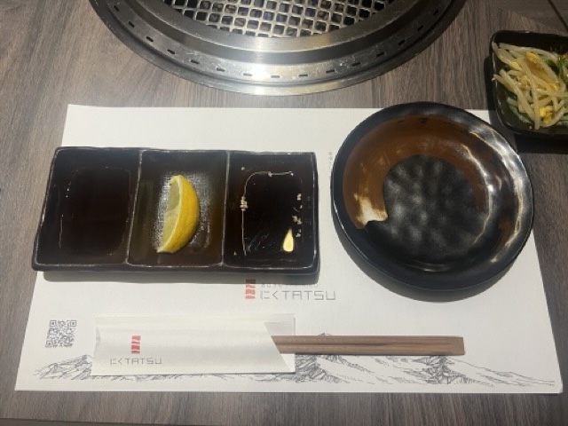 桌上擺有紙圍巾跟搭配燒肉的沾醬