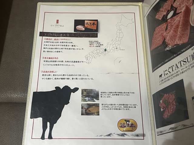 菜單內頁還簡單的介紹了日本三大和牛之一,滋賀縣的近江牛,另外兩大分別是三重縣的松阪牛和兵庫縣的神戶牛。