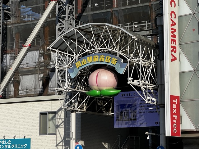 抵達岡山車站以後,接著要前往岡山城,等紅燈的時候看到對面的岡山車站前商店街的水蜜桃招牌