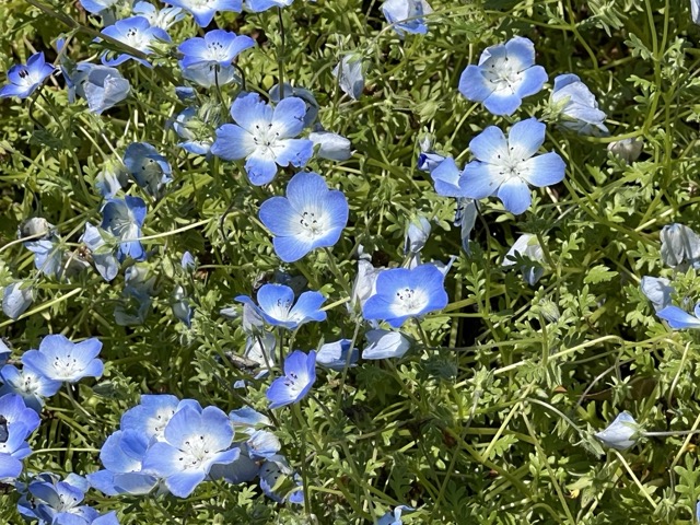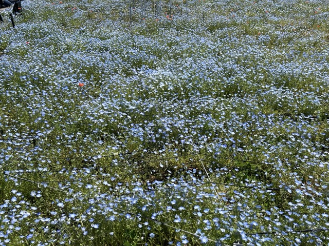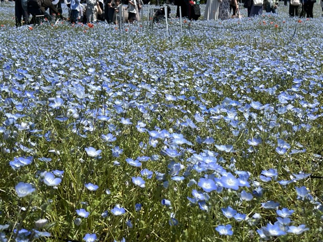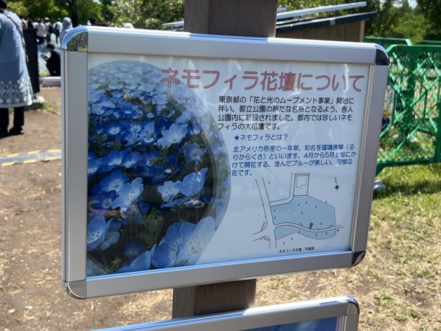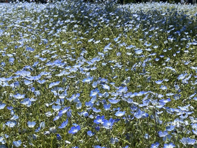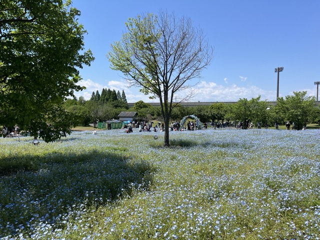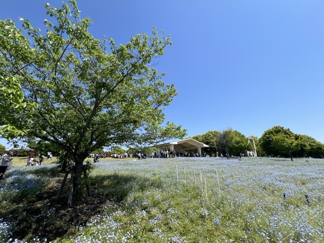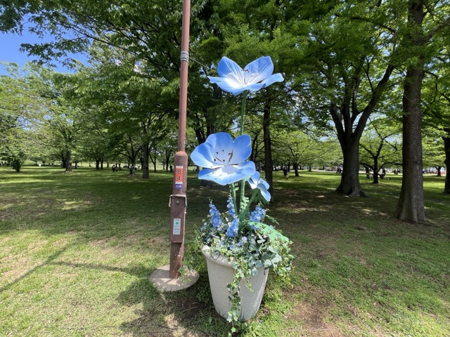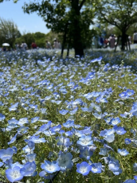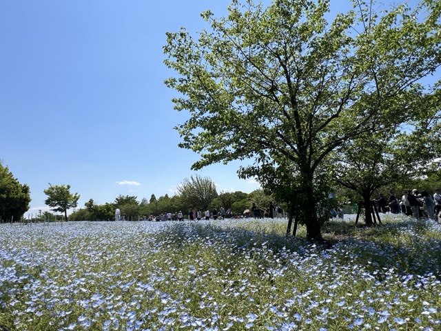 位於足立區的舎人公園,占地遼闊,擁有廣大的草坪與多樣化的親子遊憩設施。每年春季,從4月中旬到5月上旬,公園的一隅會被盛開的粉蝶花(ネモフィラ)染成一片夢幻藍海,彷彿鋪上柔美的藍色地毯,景致浪漫動人。